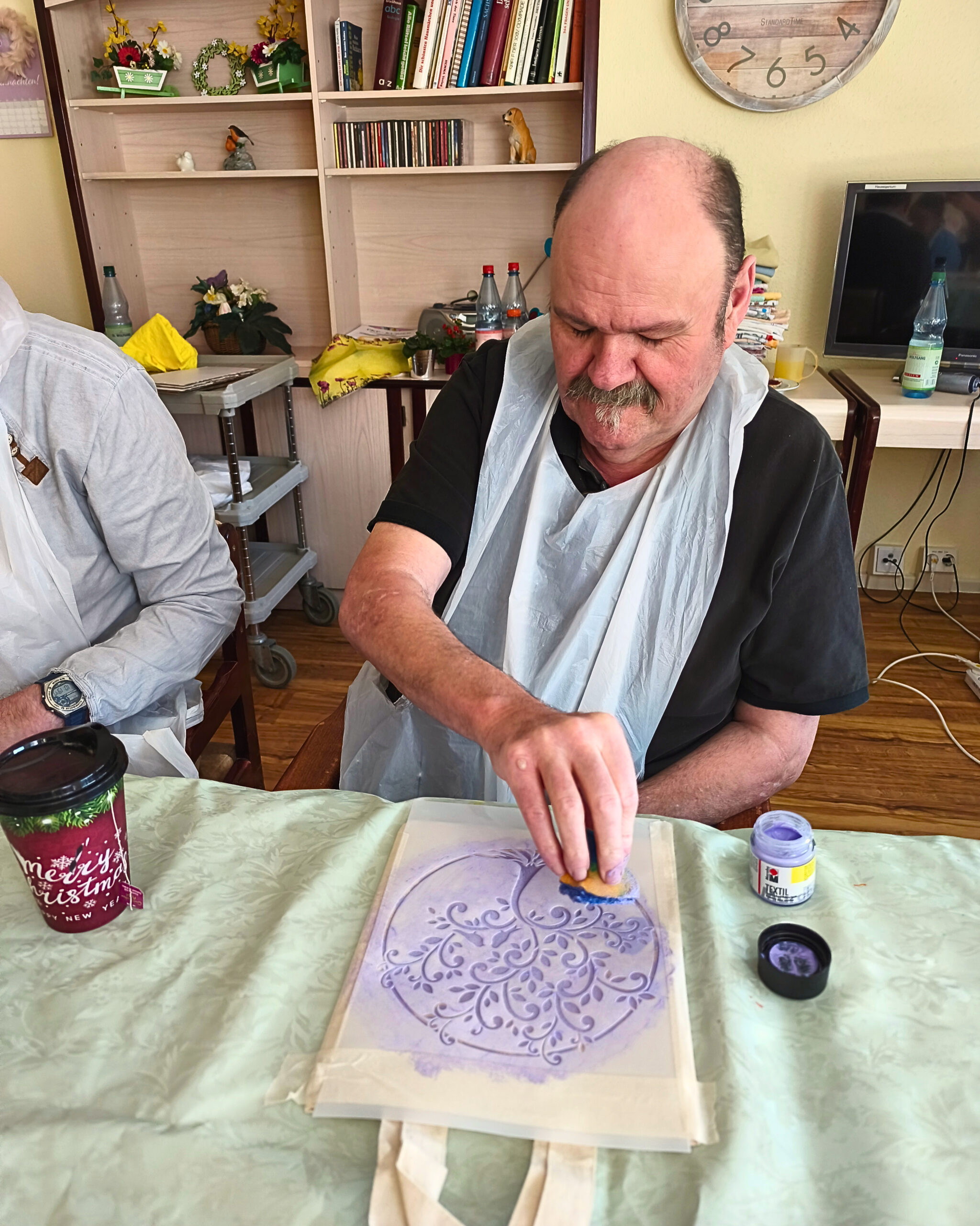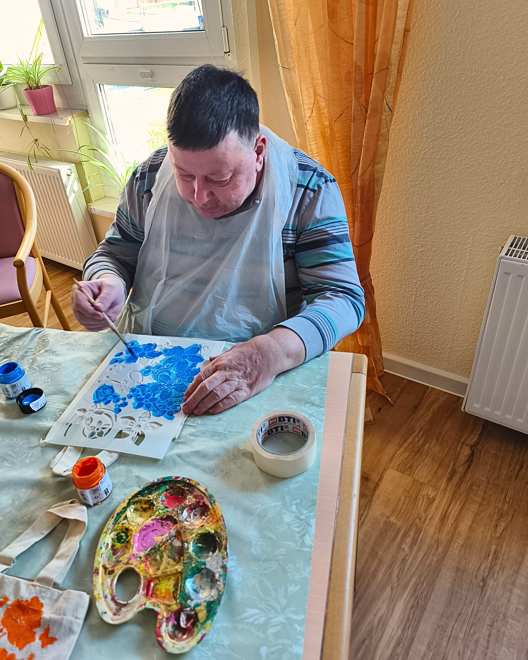 In unserer Handwerksrunde wurden mit viel Freude und Hingabe kleine Baumwolltaschen individuell gestaltet. Aus einer Vielzahl an Schablonen und Farben wählte jeder sein persönliches Motiv aus und setzte es mit viel Geduld und Kreativität um.